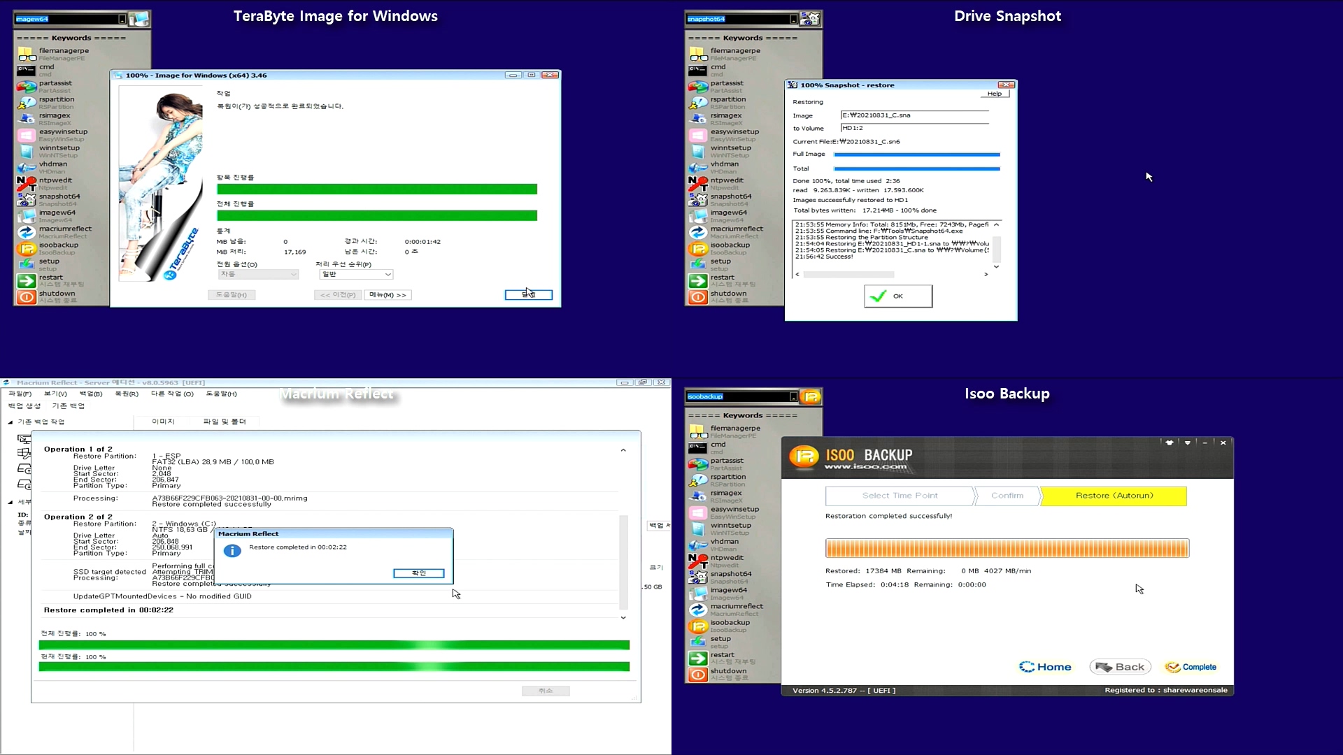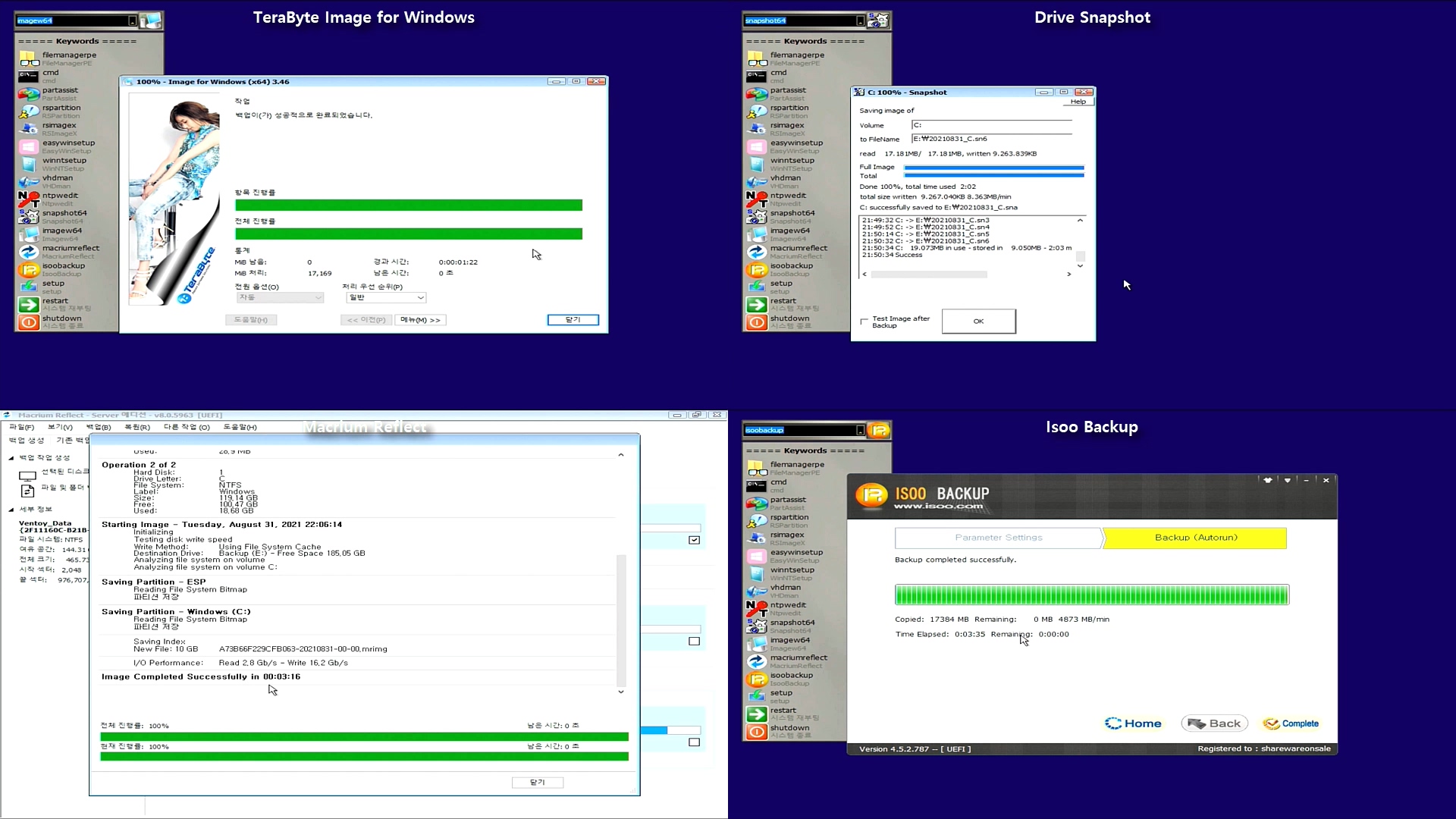 3. Macrium Reflect └▶ 백업시간 2분 36초, 백업/용량 9.50GB, 복원시간 2분 22초
