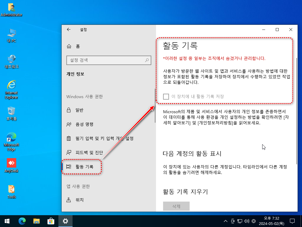 <!-- 개인 정보 및 보안 > 활동 기록 OFF -->