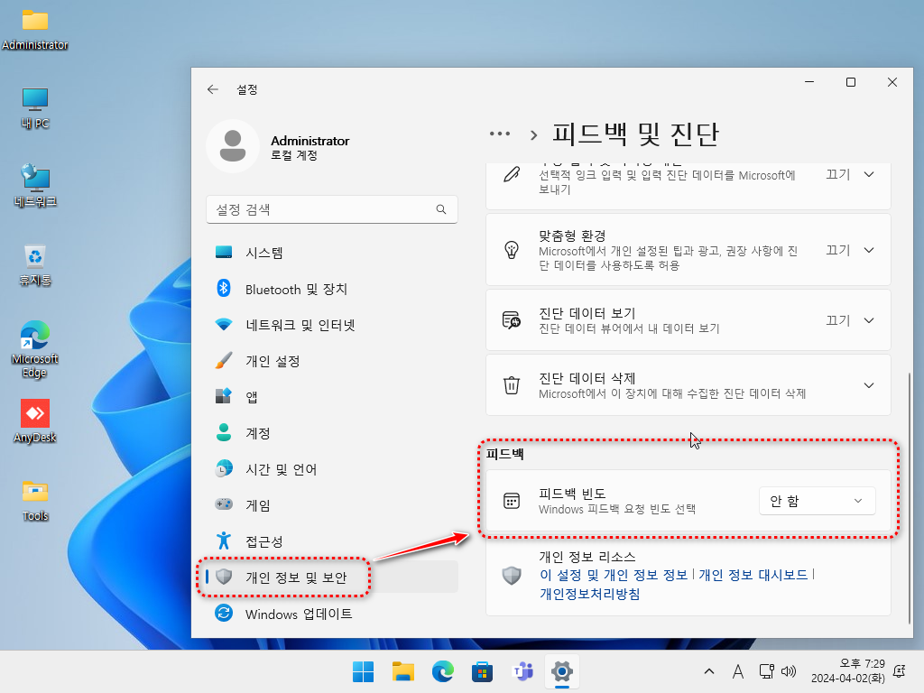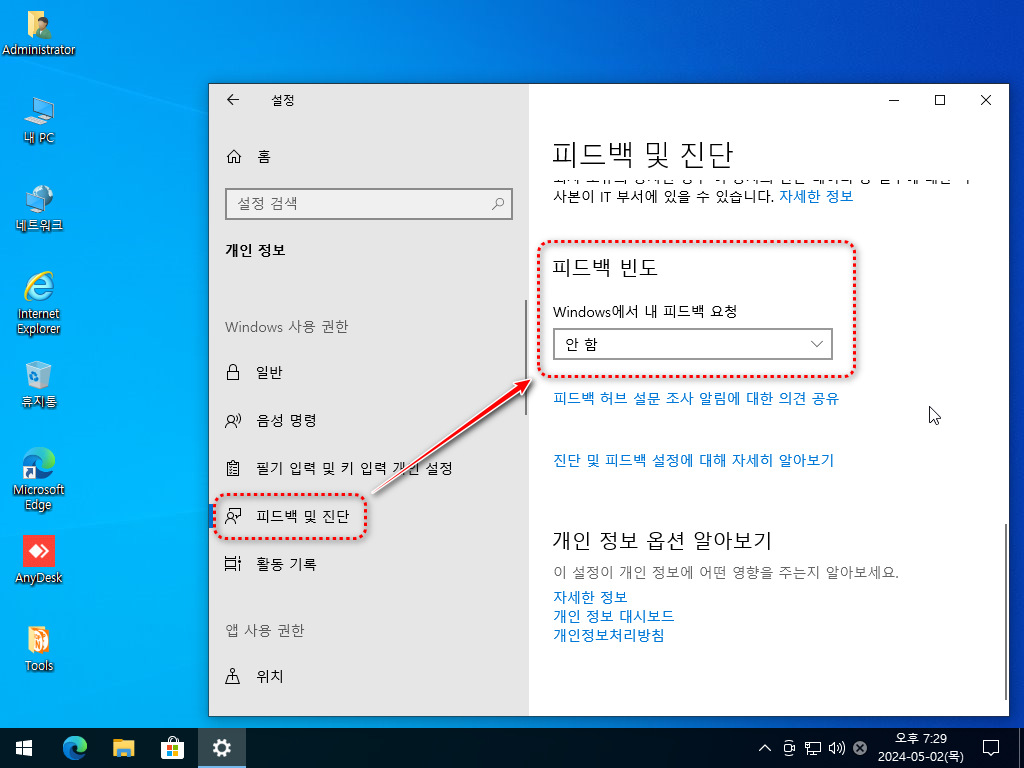 <!-- 피드백 빈도 옵션을 "Never"(프라이버시 설정)로 설정합니다. -->