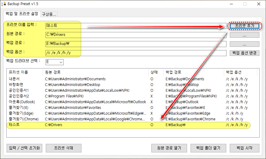 - 프리셋 이름 입력, 원본 경로, 백업 경로, 백업 옵션 입력 후 프리셋으로 저장(Setting.ini에 추가 반영됨)
