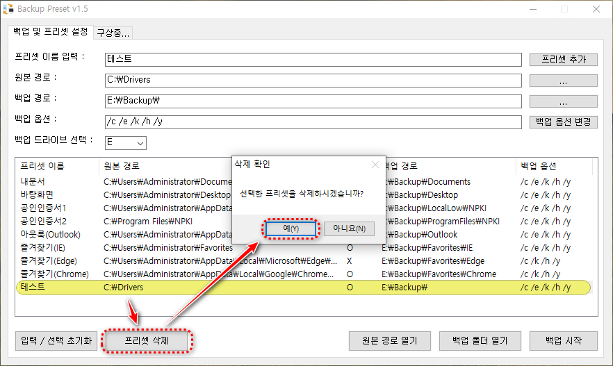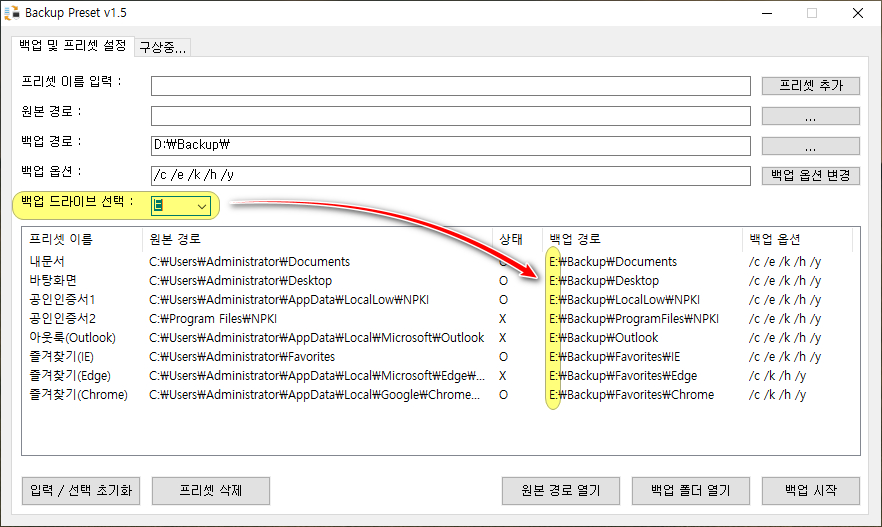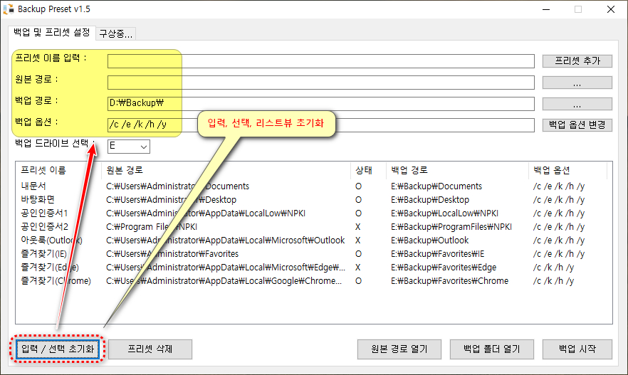 - 리스트뷰에 있는 모든 프리셋의 데이터를 xcopy 백업 옵션으로 백업 경로에 복사한다.