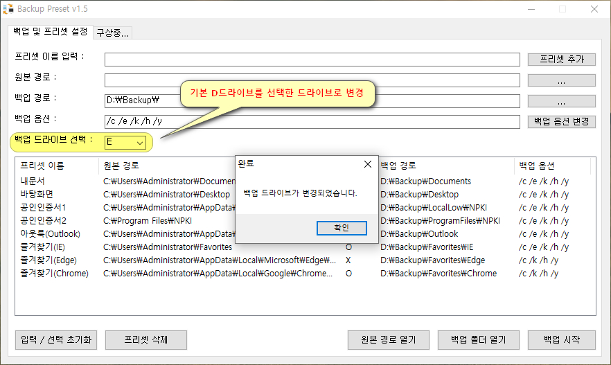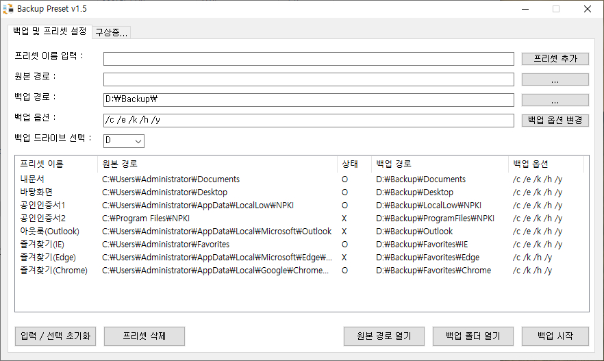 - 백업 옵션 : /c /e /k /h /y을 임의로 수정 하고 리스트뷰에 있는 프리셋 항목을 선택하여 백업 옵션을 변경