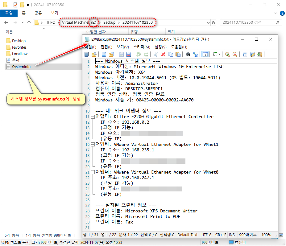 - 백업 폴더 경로에 SystemInfo.txt 파일에 윈도우 정보, 어댑터 정보, 프린터 정보를 기록한다.