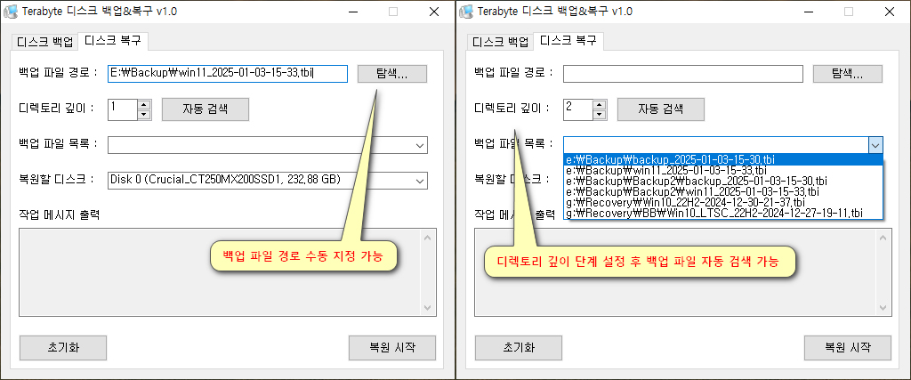 디스크 복구 시 디렉토리 깊이 단계를 설정하면, 백업 파일을 자동으로 검색하여 백업 파일 목록을 콤보박스에 출력하도록 기능이 개선되었습니다.