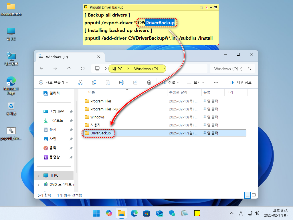 위 명령어는 시스템에 설치된 모든 드라이버를 C:\DriverBackup 폴더로 백업합니다.