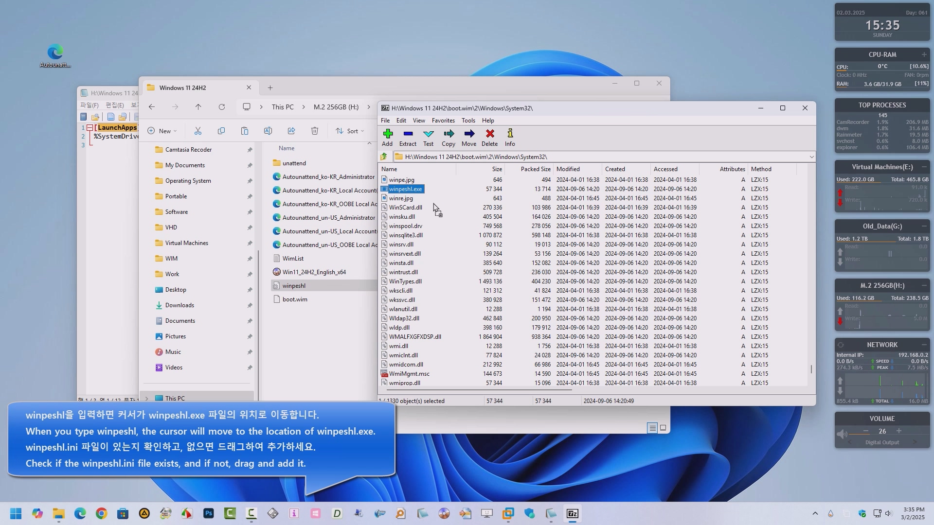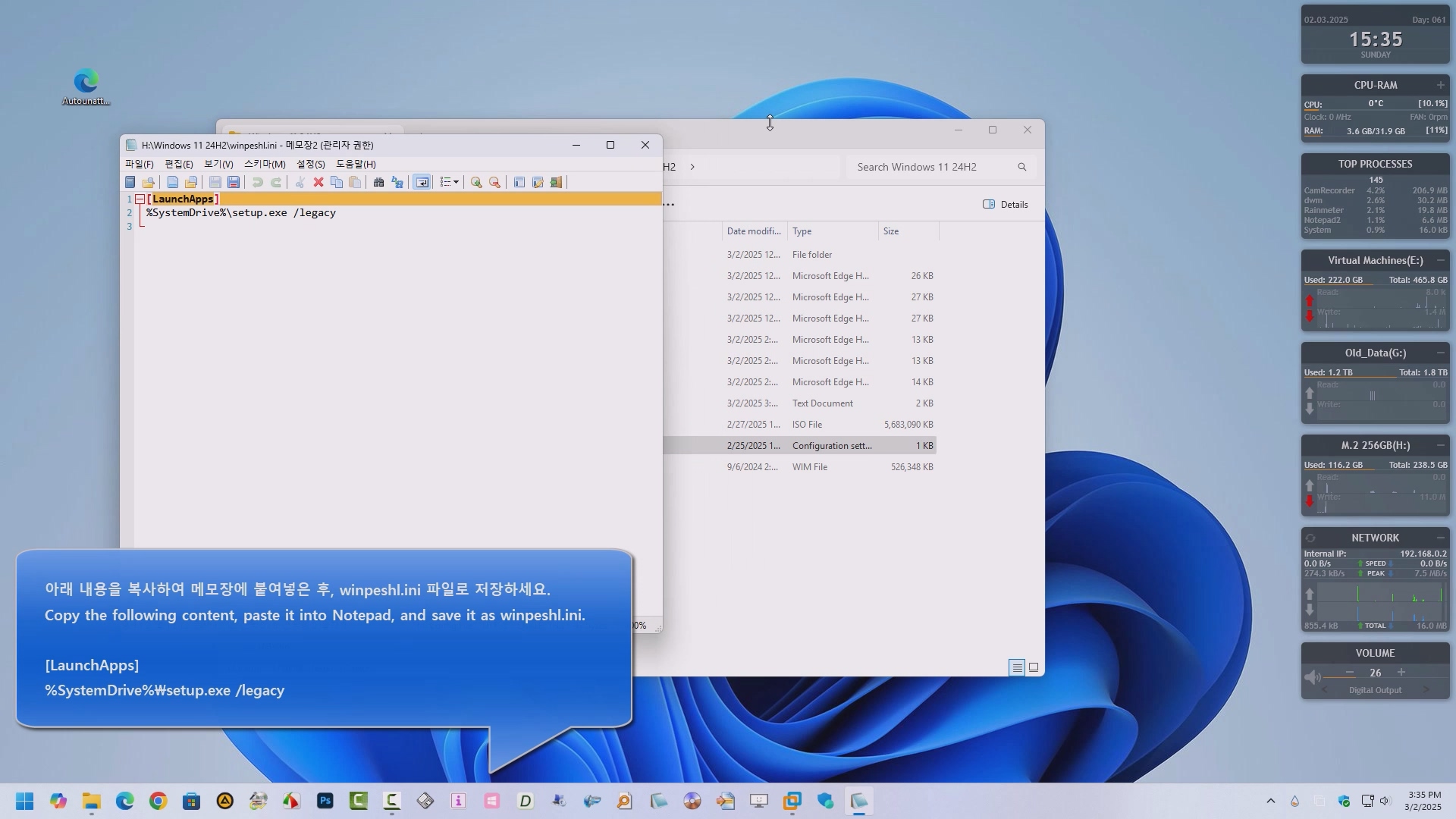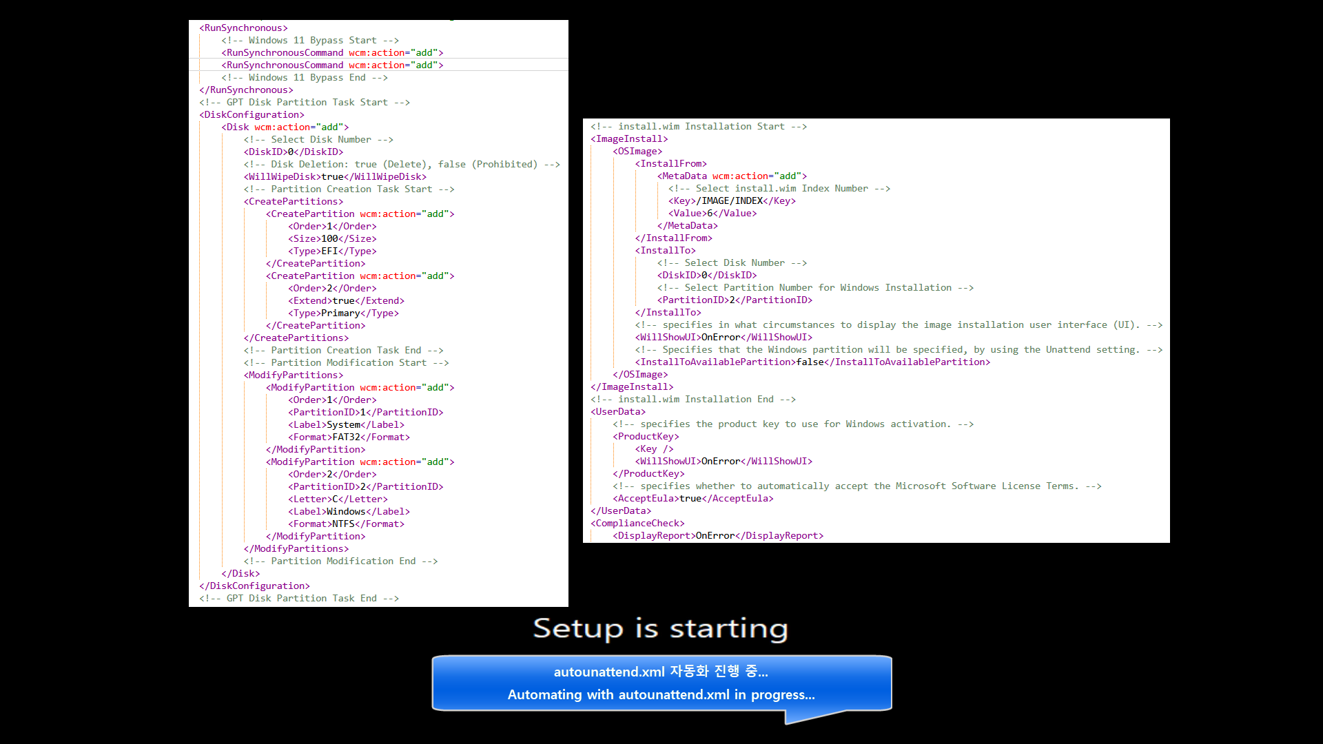 윈도우 11 24H2 버전의 boot.wim 인덱스 2번 \Windows\System32\ 경로에 winpeshl.ini 파일을 추가하면, autounattend.xml이 이전 버전의 설치로 작동합니다.