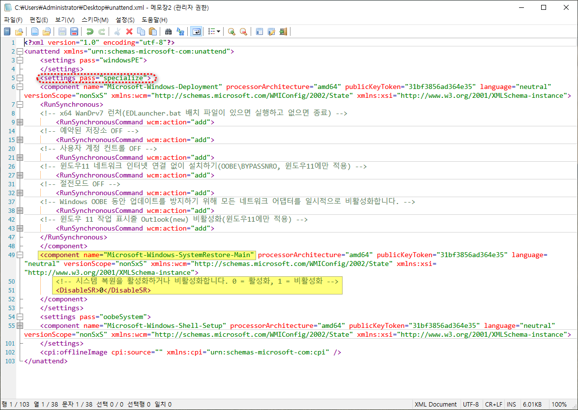 - 기존의 unattend.xml 파일을 편집하여 위의 코드를 추가합니다.