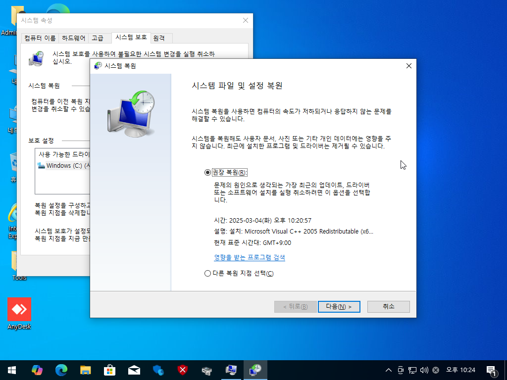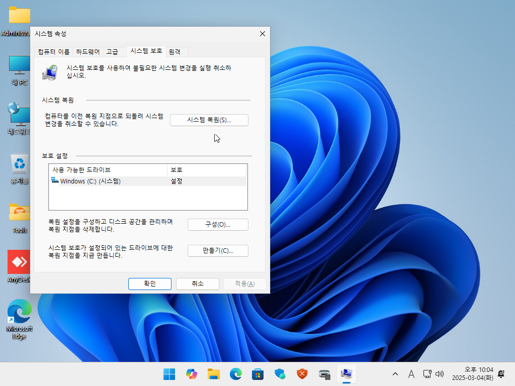 - 윈도우 설치 후 sysdm.cpl을 실행하고 "시스템 보호" 탭에서 복원이 활성화되었는지 확인합니다.