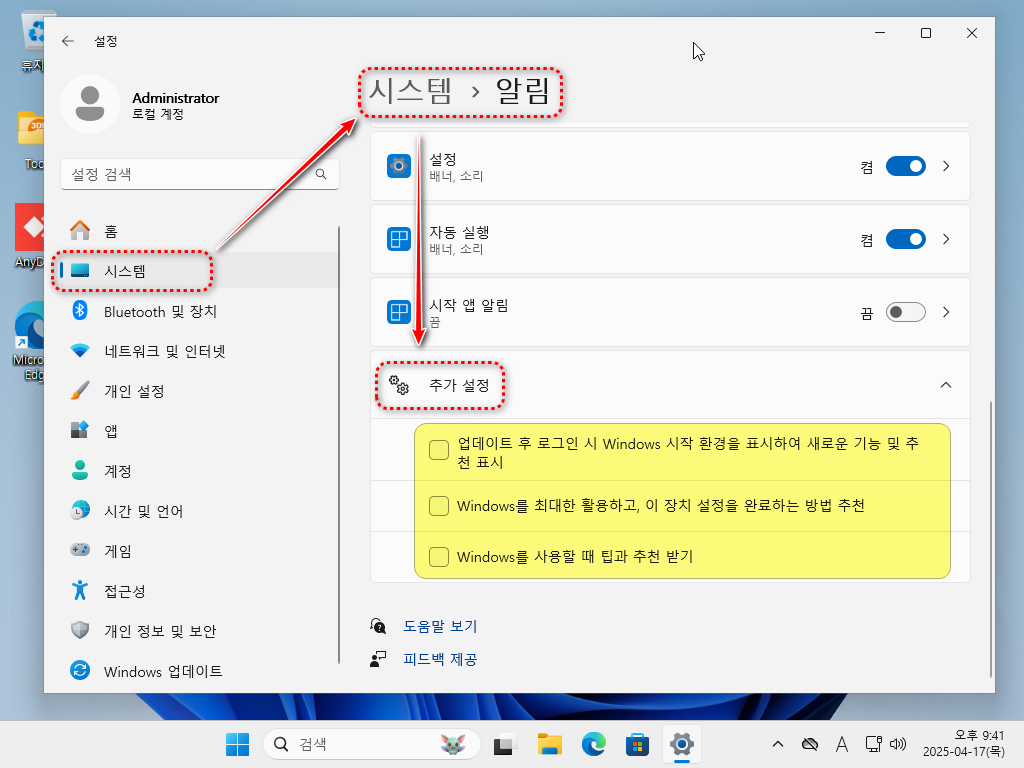 설정 > 시스템 > 알림 > 추가 설정