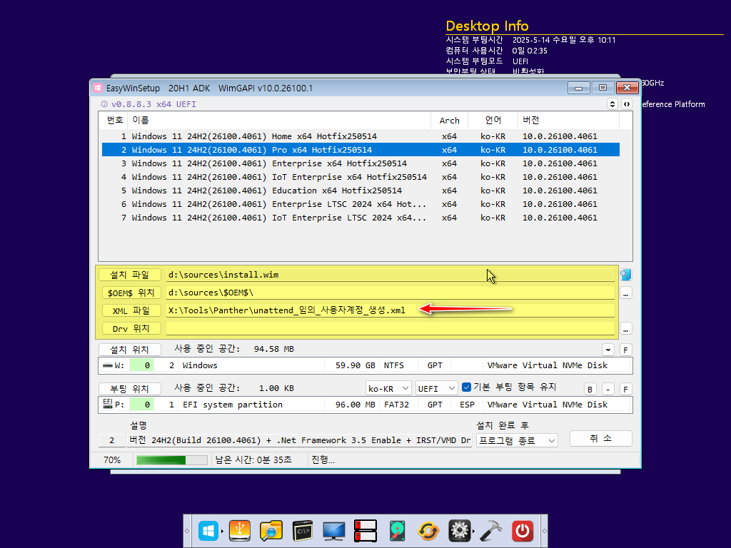 순수 설치는 ISO > Sources > $OEM$ 폴더 삭제(or 이름변경) 후 사용 가능합니다.