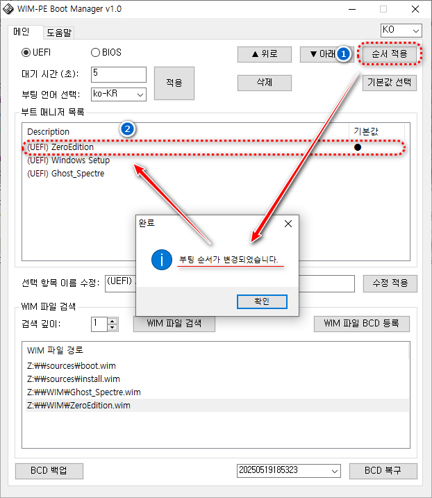 WIM 파일을 폴더 깊이 단계 설정으로 검색 하여 검색한 WIM 파일을 BCD에 등록 함