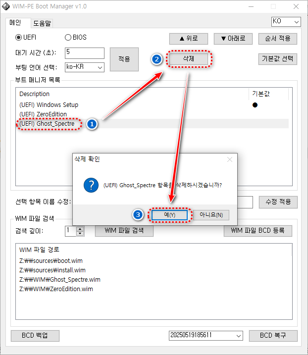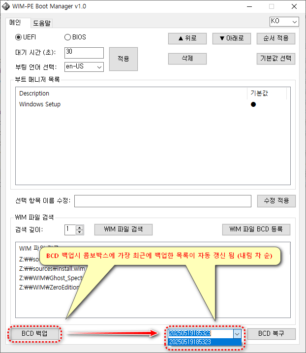 - BCD 백업시 콤보박스 목록에 추가 되고 가장 최근 목록이 선택 됩니다.