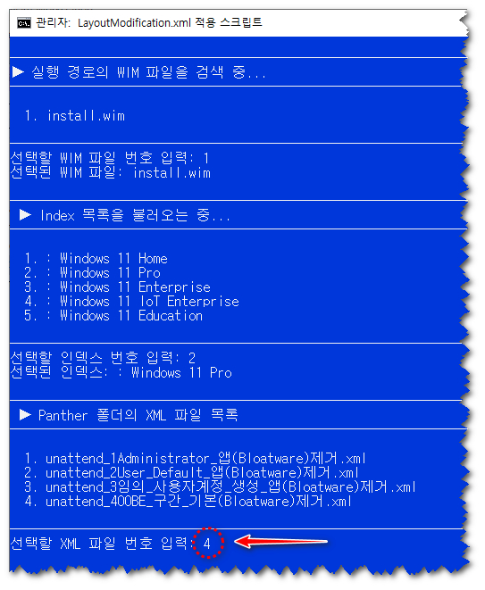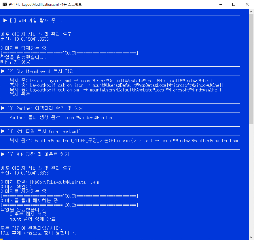 - CopyToLayoutXML.cmd를 실행하여 필요한 파일을 install.wim에 적용합니다.