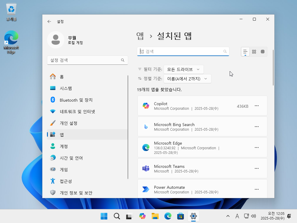 - 적용된 install.wim을 사용하여 윈도우를 설치하면, 시작 메뉴가 초기화되고 불필요한 앱이 제거된 상태로 설치됩니다.