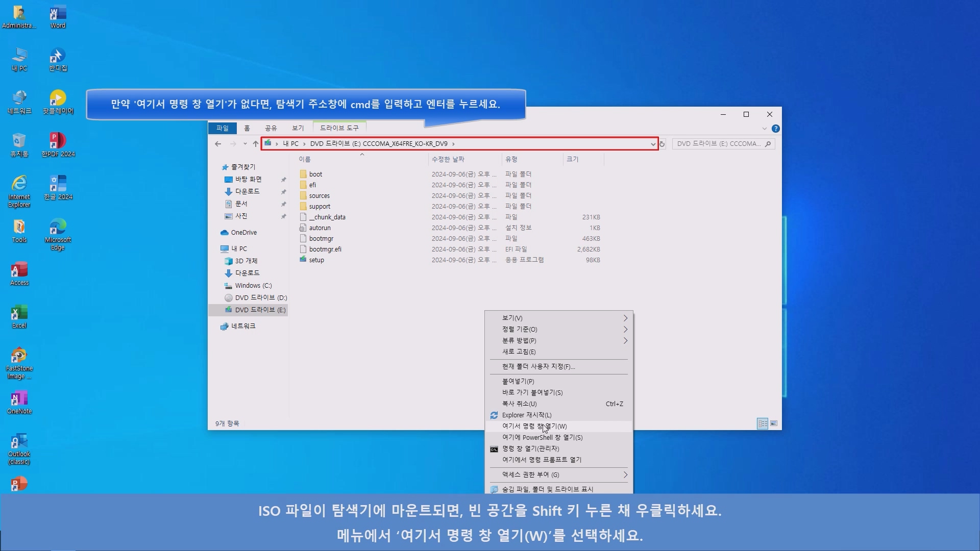 - 탐색기에 ISO 파일이 마운트되면, 빈 공간에서 **Shift 키를 누른 상태로 마우스 우클릭 → 여기서 명령 창 열기(W)**를 클릭합니다.