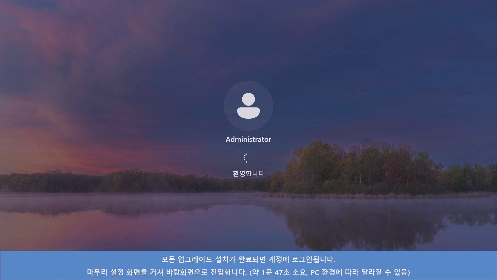 - 재부팅 후 업데이트 작업이 0% → 100%까지 진행 (약 2분 54초, PC 환경에 따라 상이)