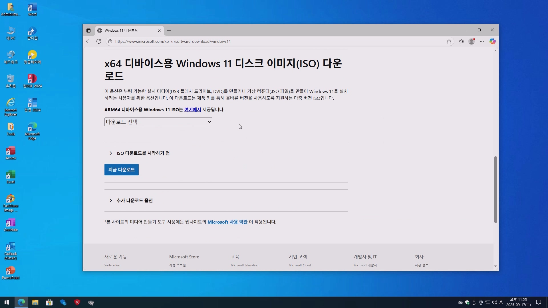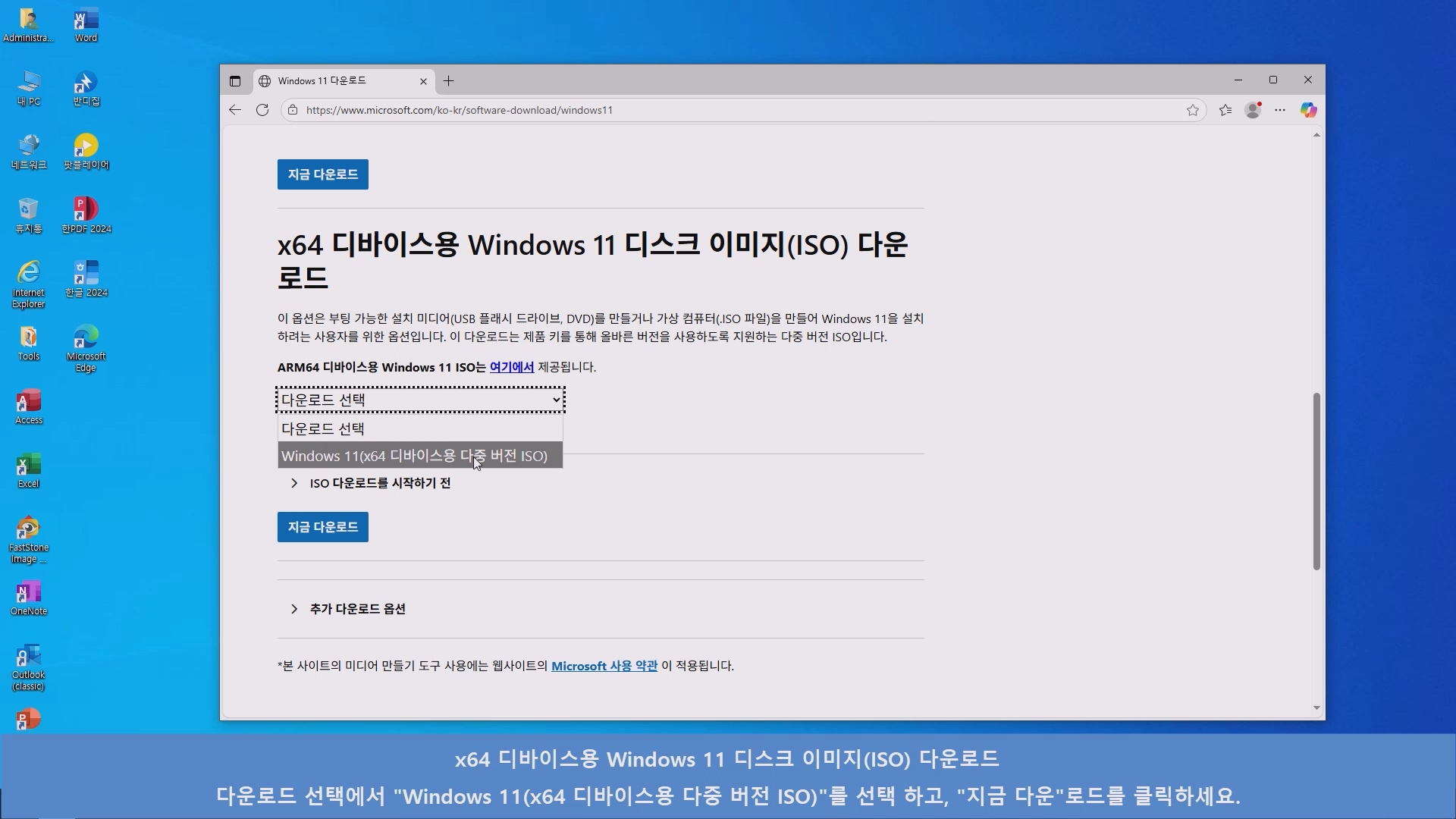 - **Windows 11 (x64 디바이스용 다중 버전 ISO)**를 선택한 뒤, 지금 다운로드를 클릭합니다.