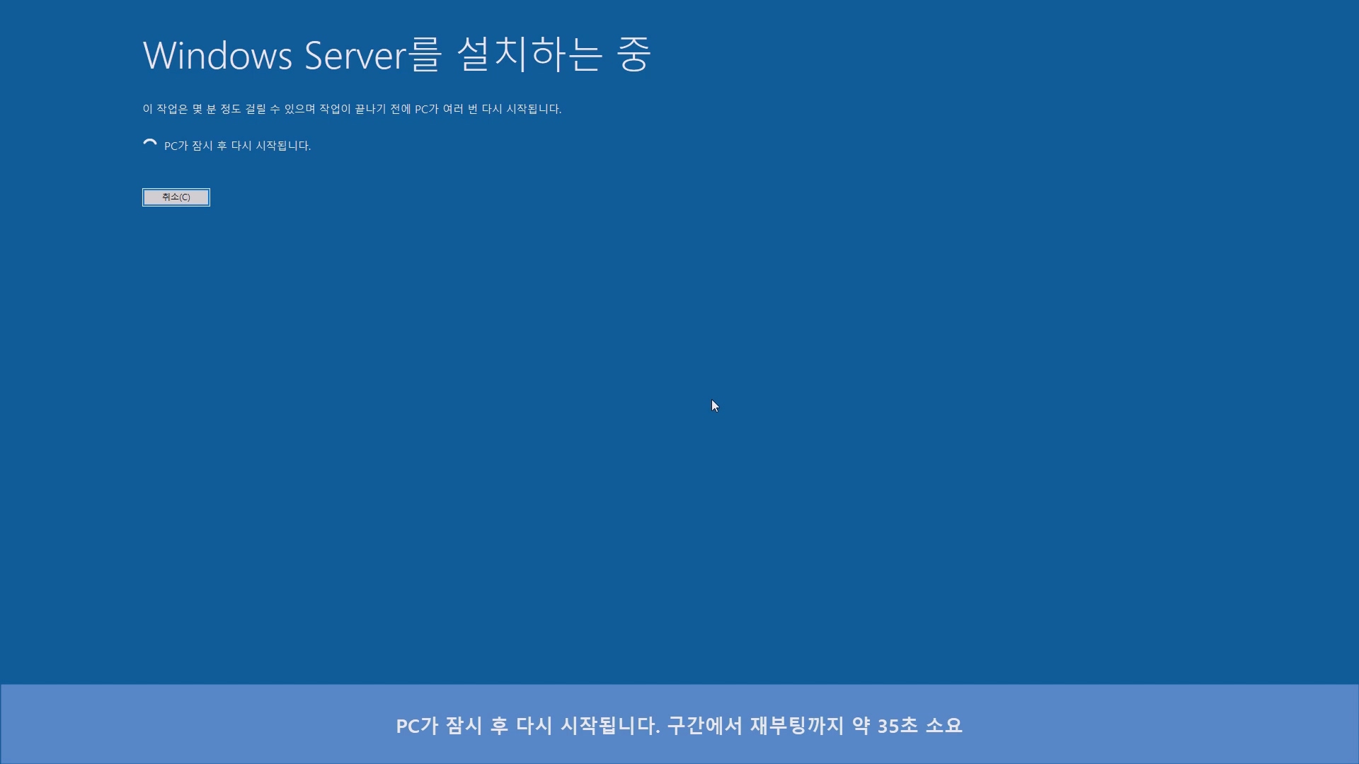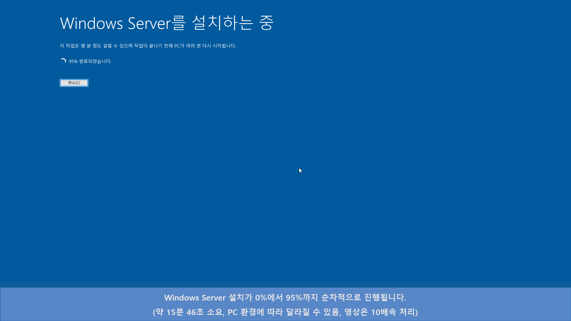 - Windows Server 설치가 0% → 95%까지 진행 후 PC 자동 재부팅 (약 15분 46초, PC 환경에 따라 상이)