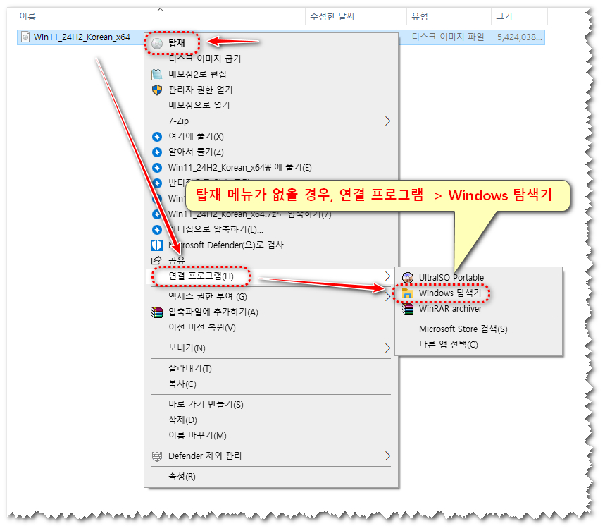 ISO 파일 선택 > 속성 > 일반 > 연결 프로그램 > 연결 버튼 클릭 > 기타 옵션 > Windows 탐색기 > 확인 클릭