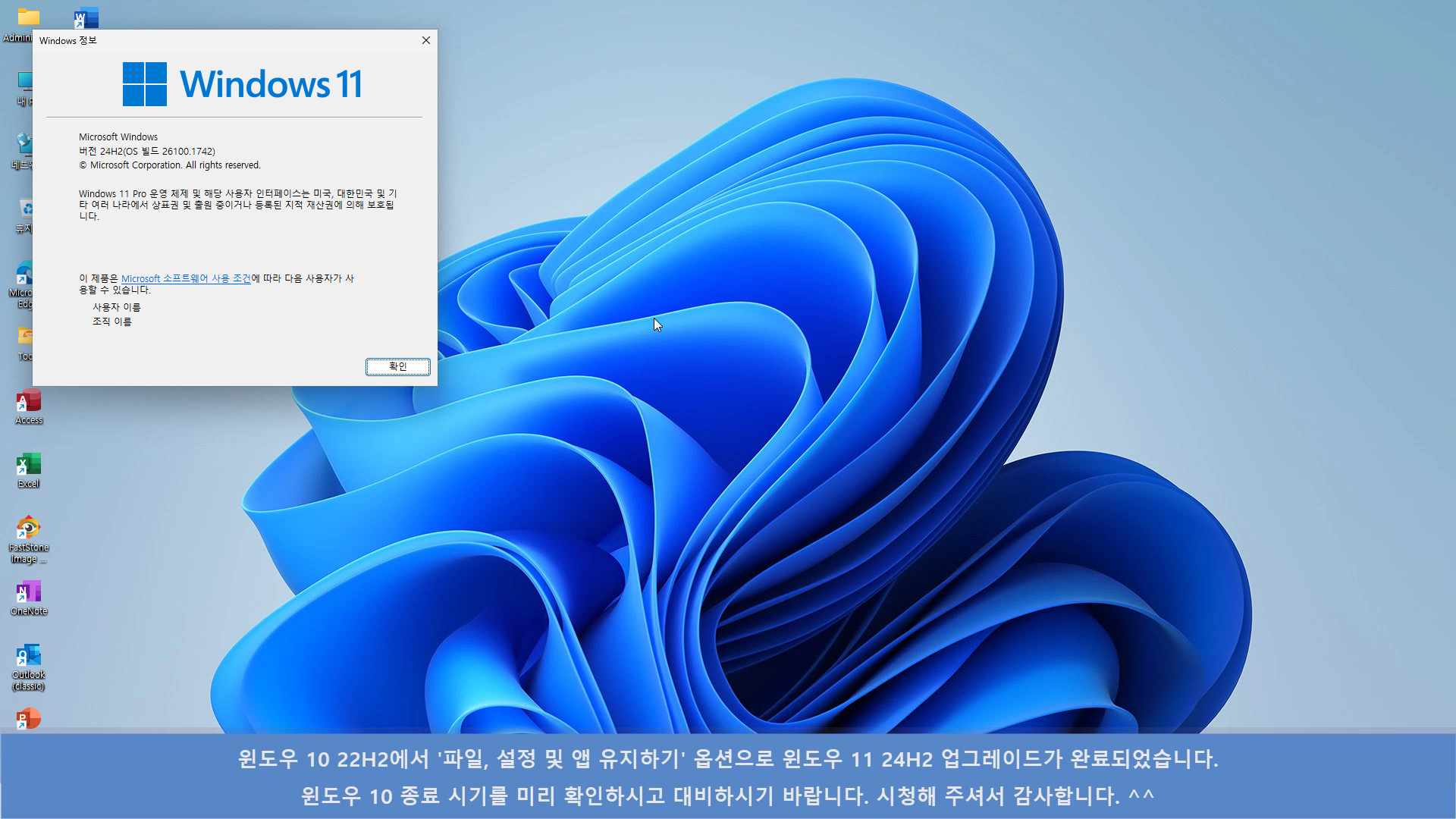 - 윈도우 10 22H2에서 ‘파일, 설정 및 앱 유지하기’ 옵션으로 윈도우 11 24H2 업그레이드 설치가 완료되었습니다.