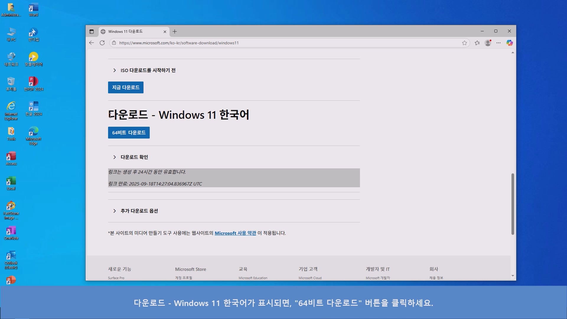 - 이후 나타나는 화면에서 64비트 다운로드 버튼을 클릭하면 ISO 파일 다운로드가 시작됩니다.