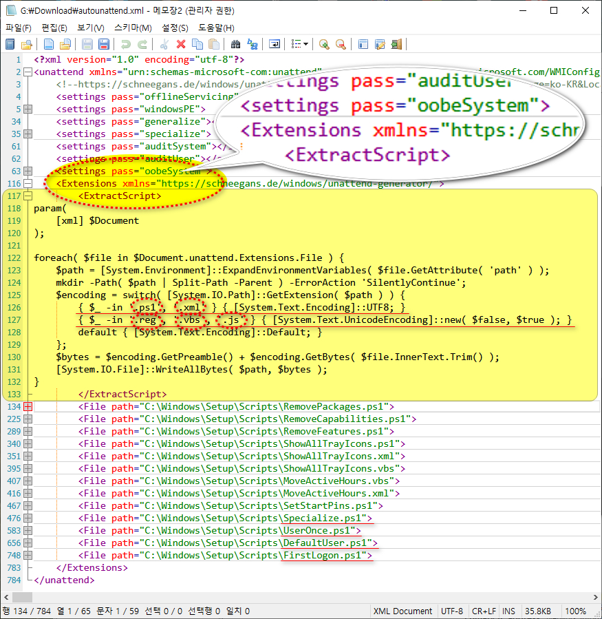 - Sysprep이나 무인 설치 도구 제작 시, XML에 포함된 스크립트를 빠르게 분리하여 디버깅 가능