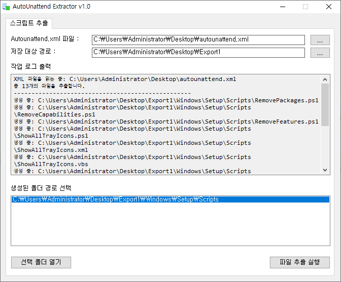 4️⃣ 추출 완료 후, 생성 폴더 리스트에서 폴더 선택 → [선택 폴더 열기] 클릭 모든 스크립트가 자동으로 복원되어 배포 폴더 구조를 그대로 재현합니다.