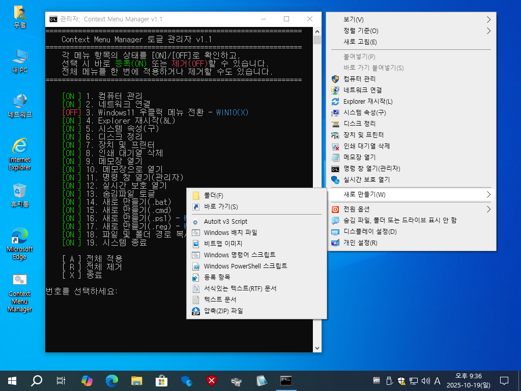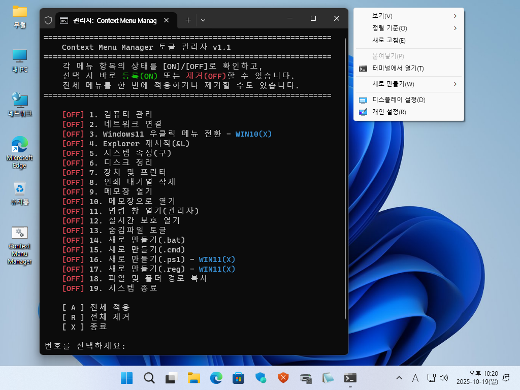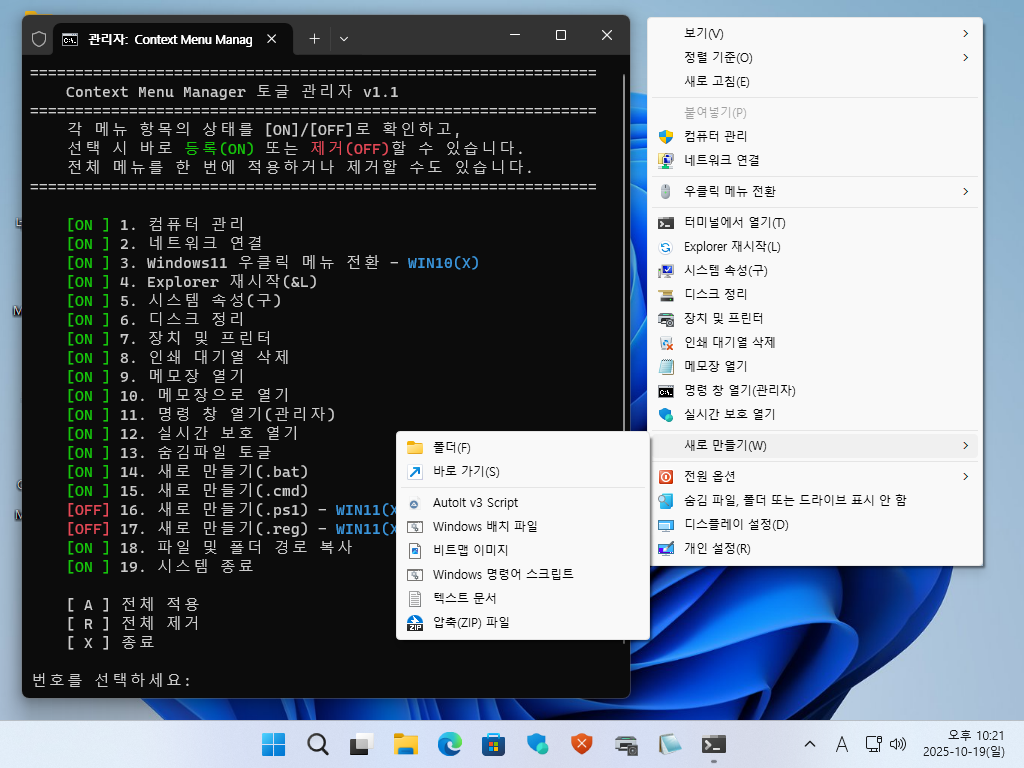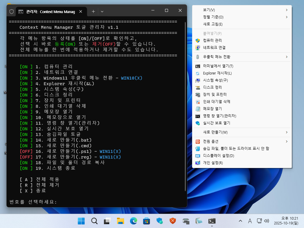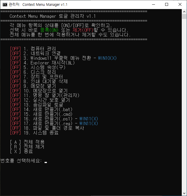 Context Menu Manager v1.1은 Windows 10과 11을 자동 감지하여 사용자 지정 우클릭(컨텍스트) 메뉴 항목을 토글 방식으로 관리할 수 있는 배치 스크립트입니다. 각 메뉴 항목은 [ON] 상태일 때 등록됨, [OFF] 상태일 때 제거됨을 의미하며, 단일 항목뿐 아니라 전체 일괄 등록 / 제거 기능도 제공합니다.