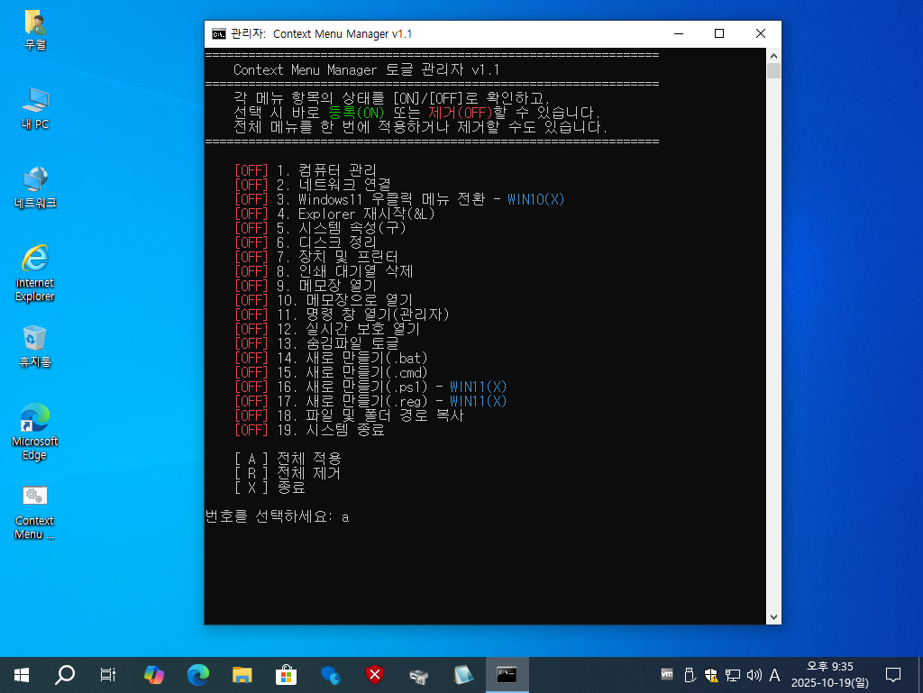 (A 전체 적용 / R 전체 제거 / X 종료) - Windows 10/11 환경에 따라 자동 예외 처리됨
