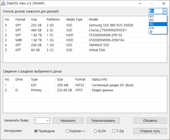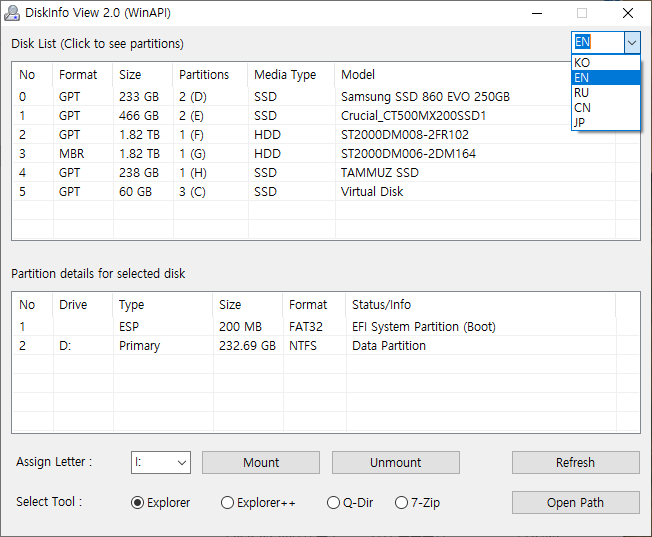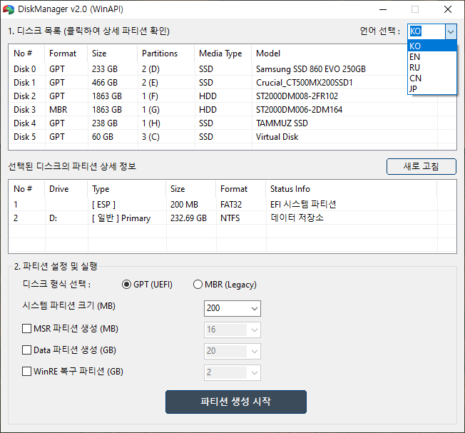 DiskInfo View 2.0 (WinAPI) 버전은 기존 Diskpart 의존형 구조에서 한 단계 더 발전하여, 핵심 디스크/파티션 정보 조회를 Windows API 기반으로 재구성한 버전입니다. 즉, 단순히 diskpart 출력 결과를 파싱하는 방식이 아닌, DeviceIoControl을 직접 호출하여 물리 디스크를 제어하고 분석하는 구조로 변경한 것이 가장 큰 특징입니다.