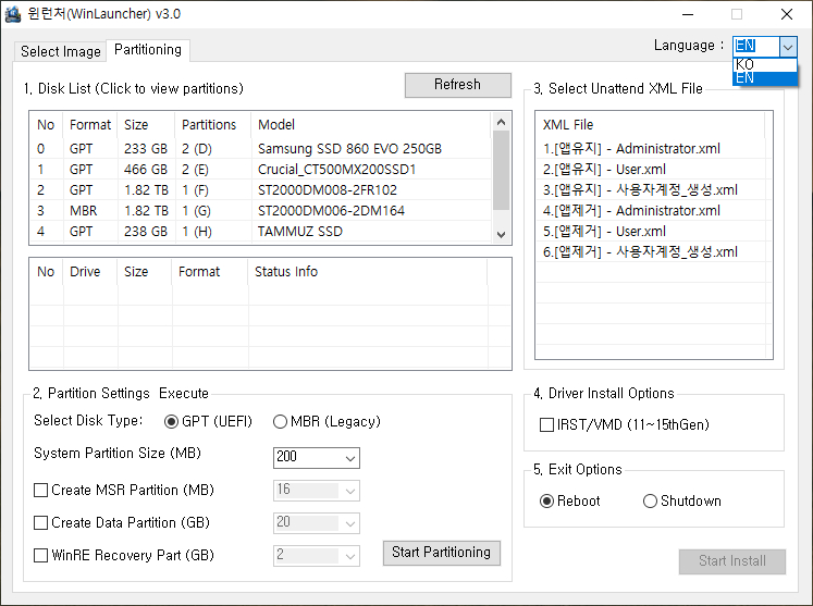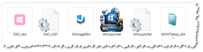 실행 파일은 WinLauncher와 동일한 폴더에 있어야 하며 와일드카드(EWS*.exe, RSImageX*.exe, WinNTSetup*.exe) 방식으로 자동 검색됩니다.