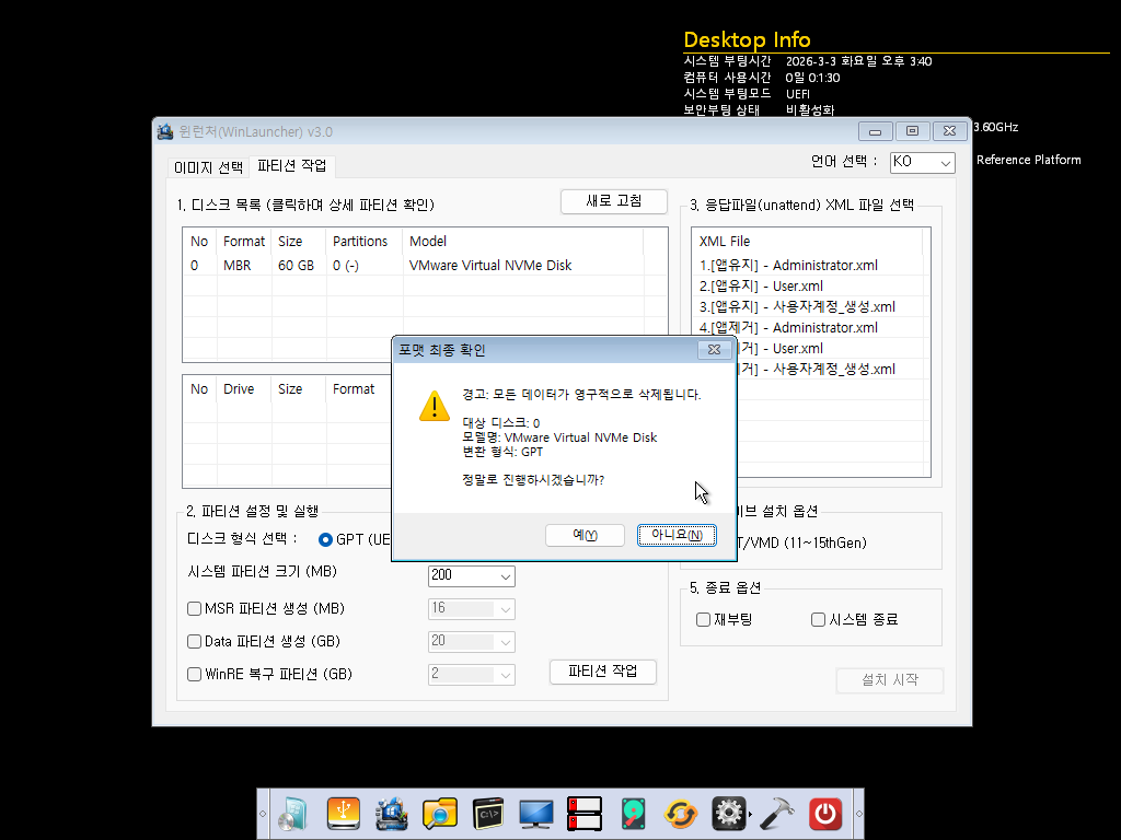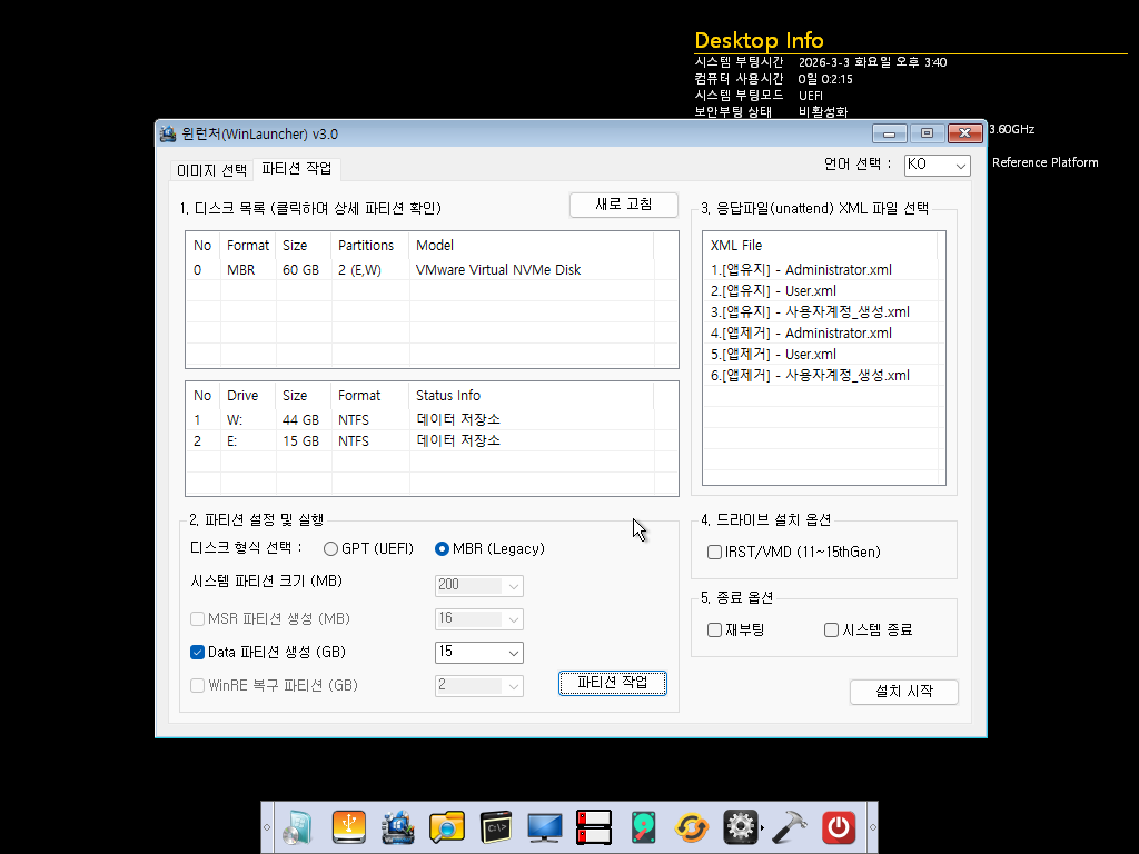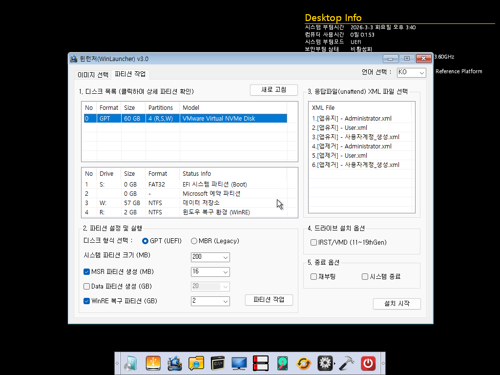 현재는 기본적인 기능 구현 위주로 제작된 상태이므로, 일부 미지원 환경에서는 파티션 기능을 사용할 수 없습니다. - 기본 Windows boot.wim 환경 또는 WMI 기능 사용이 가능한 PE 환경에서만 정상 동