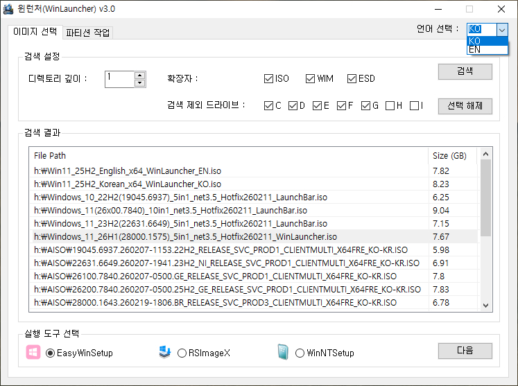 WinLauncher v1.0 (윈런처) 소개Windows 설치를 자주 진행하다 보면 ISO, WIM, ESD 파일이 여러 드라이브와 폴더에 흩어져 있어 매번 찾는 과정이 번거롭습니다. 또한 설치 도구인 EasyWinSetup, RSImageX, WinNTSetup